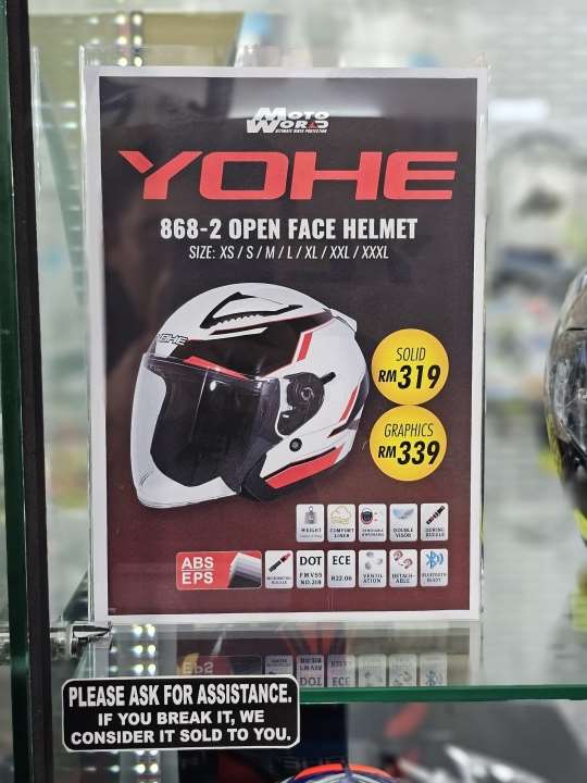 Ditawarkan pada harga RM319 untuk warna solid dan RM339 bagi pilihan grafik, YOHE 868-2 ditawarkan dalam pelbagai pilihan saiz dari XS sehingga XXXL yang memberikan fleksibiliti kepada pelbagai jenis bentuk kepala.