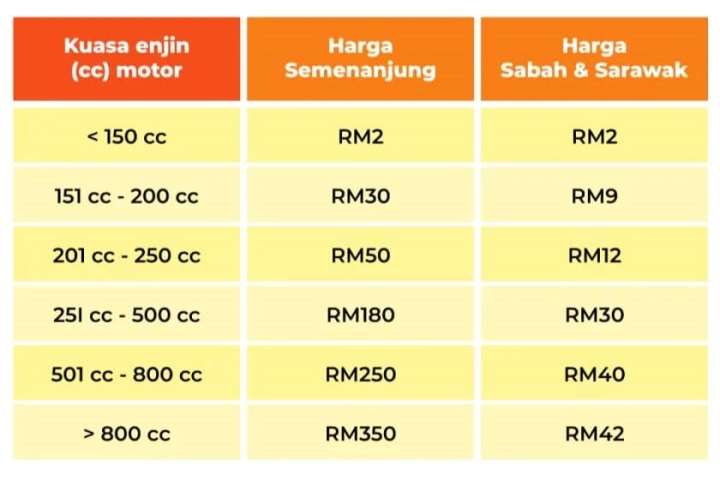 Berikut adalah harga cukai jalan bagi motosikal: